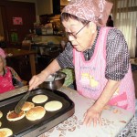 生地はピンクと緑のを用意しました。薄く伸ばして焼くのはけっこう大変で、、、ひっくり返す時は、なかなかうまく返せず、グチャグチャに(+_+)「あ~!」「端ひっぱって~」など大騒ぎ。