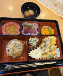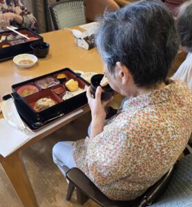 昼食は松花堂弁当を頂き、おやつはカステラを頂きました。お昼のお重を見て「豪華やな…」と言われる方や、「毎日こんなんがええわ」と笑われる方なども居られました。