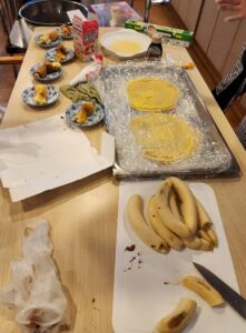 甘い匂いがフロアに漂い、出来た生地にバナナや生クリームやチョコレートソースをトッピングして巻いて出来上がり!