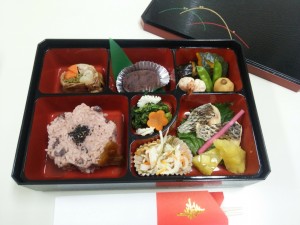 1月1日昼食:赤飯、鯛の塩焼き、八幡巻、煮しめ、酢味噌和え、紅白なます、芋ようかん、おはぎ