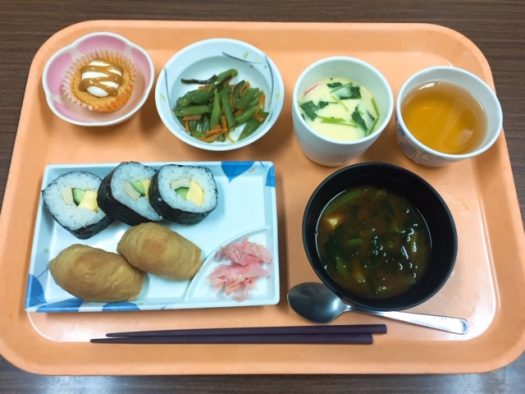 助六寿司・いんげんの昆布和え・茶碗蒸し・赤だし・塩キャラメルケーキ