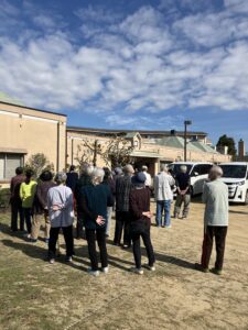 今回は夜間に火災が発生したと想定し、施設前のグラウンドに避難しました。