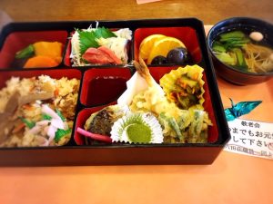 松茸ごはん・天ぷら・鰆西京焼・炊き合わせ・お造り・フルーツ・漬物・おすまし