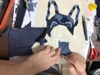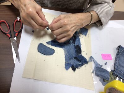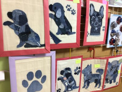 制作活動ではジーンズの端切れ生地を白い布にボンドで貼り、貼り絵のようにして犬の絵を仕上げました。1枚ずつ丁寧に配置していくと、可愛らしい犬の姿が完成!「こんな貼り絵は初めて」「とっても可愛くできたね」と喜びの声が上がり、皆様の作品が並ぶと小さなギャラリーのようでした