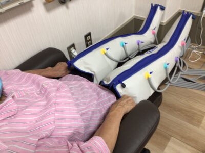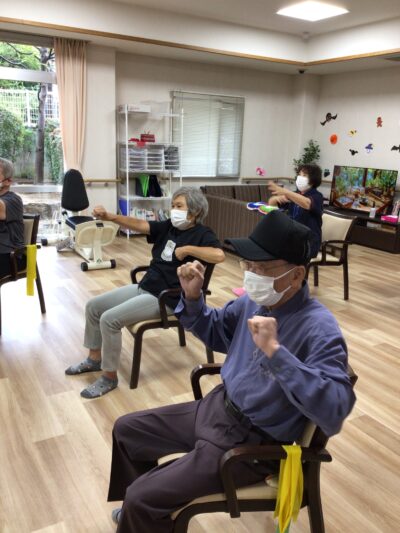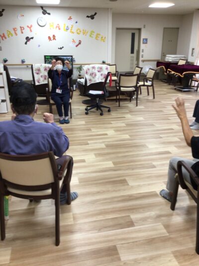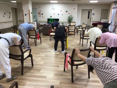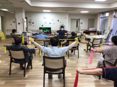 全身をしっかり動かし、「身体がほぐれて気持ちいいね」「続けることで元気でいられるね」とお話してくれています。また、入浴やリラクゼーションで足を癒されたり、カラオケをしたりと運動以外での楽しみの時間を作っていただき、ゆっくりとされながら皆さま笑顔で過ごされております。