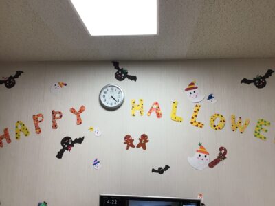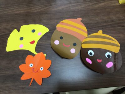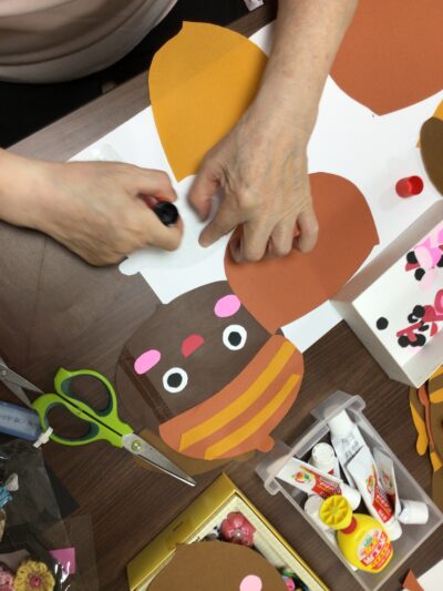 10月の最終週は「秋」をテーマにした壁飾り作りをしました。落ち葉やどんぐり又、紅葉したモミジなど「秋」の自然をモチーフにし色画用紙や折り紙で制作し楽しんでいただきました。
