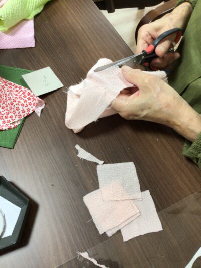 布を選び「どの色が合うかな」「私は青がいい」「赤色がいい」と皆さん真剣な表情で選び