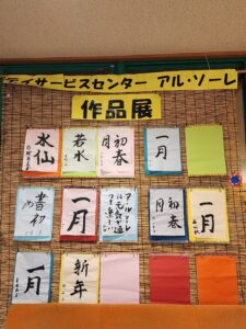 さて、新年を迎えたので皆さまには書初めに挑戦して頂きました。簡単な『一月』から難しい『初春月』などお好きな手本を見ながら書いて頂きました。出来たものは一人1枚ずつフロアに飾らせて頂きました。