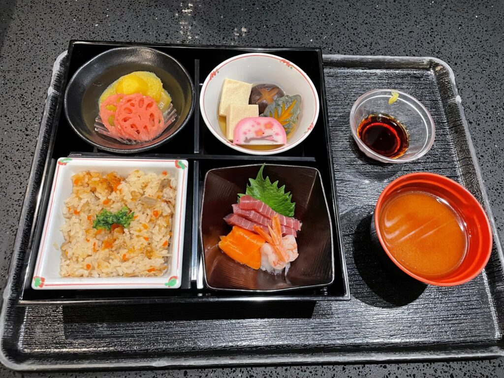 ・散らし寿司 ・鯛の塩焼き、伊達巻 ・御煮しめ ・紅白なます、黒豆、数の子 ・すまし汁 ・フルーツ