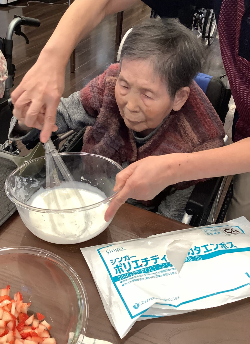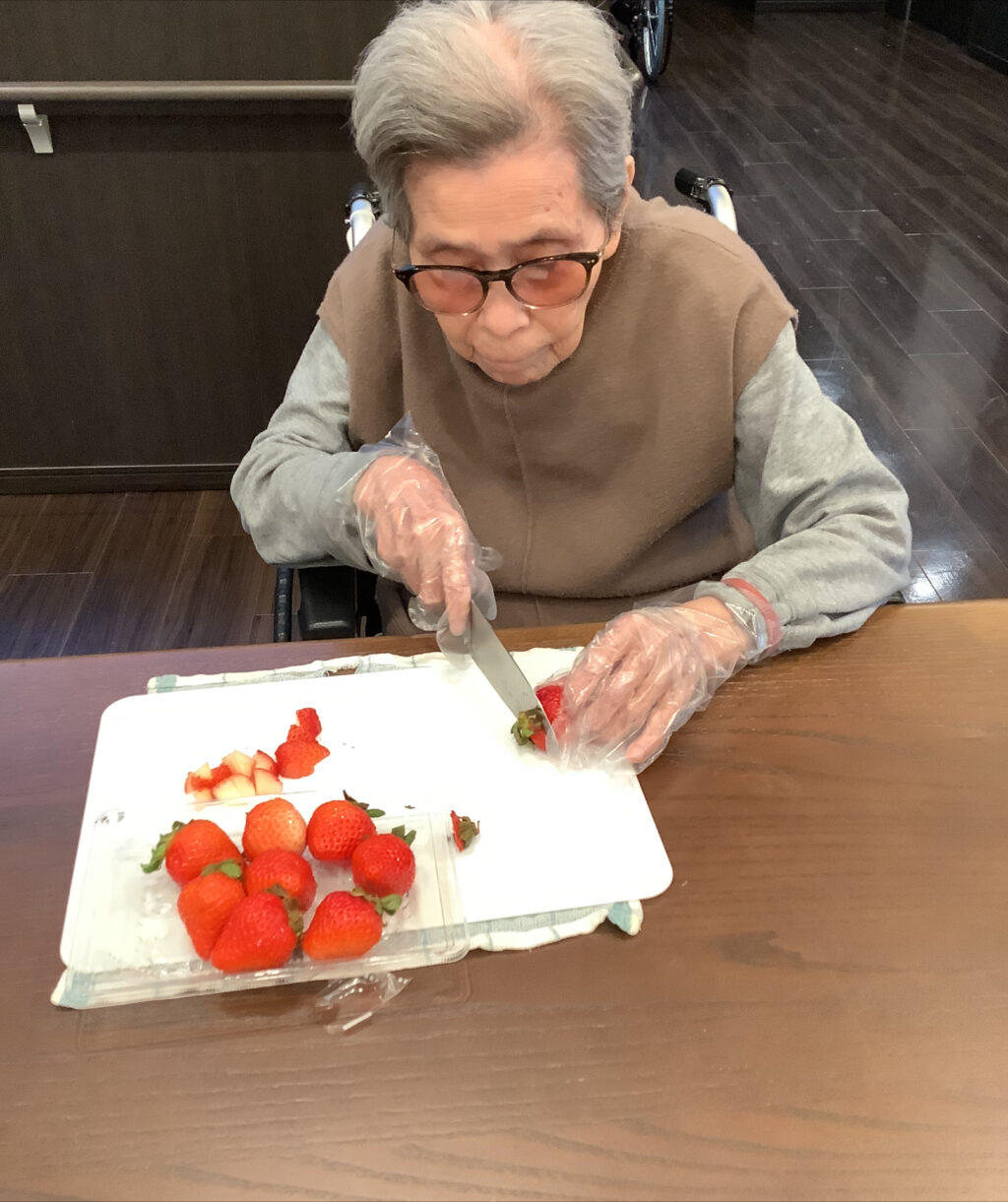 いちごを見て「おいしそうないちごやな~」「遠くからでもいちごのいい匂いするわ」と喜んでおられたり、「包丁持つの久しぶりやわ~、大丈夫かな」と心配そうにされていましたが上手に切ってくださっていました。
