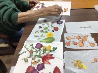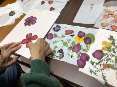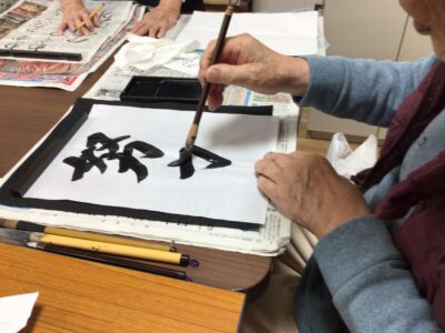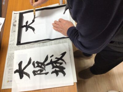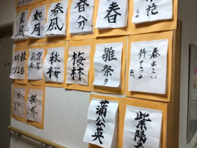 お習字で「春風」「春分」など春を感じる言葉を丁寧に書かれ、真剣な表情で筆を持たれていました。書きあがった作品はどれも力強く、個性あふれる素敵な作品です。