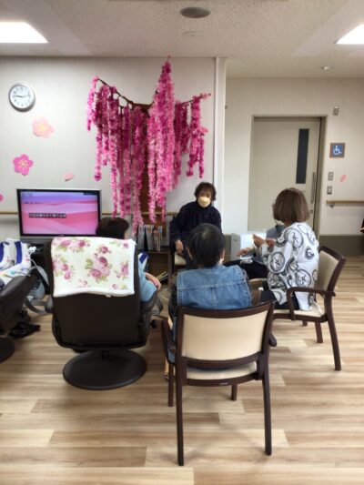 お話にも花が咲き、デイの枝垂れ桜も満開に