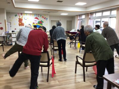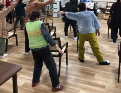 職員の掛け声に合わせて腕を伸ばしたり、足を上げたりと、皆さま真剣な表情で取り組まれていました。