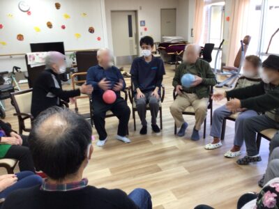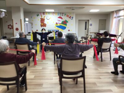 今週も短い時間のなかで、しっかり体を動かし、楽しみながら過ごしていただきました。まずは恒例の 機能訓練体操。