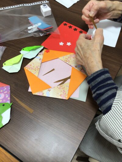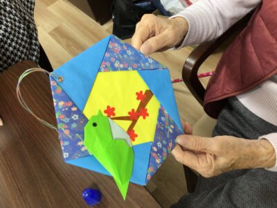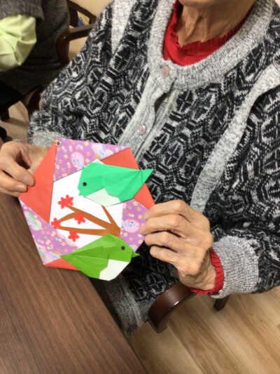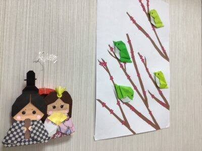 制作活動では、折り紙でウグイスを折り、梅の花をパンチで抜いて貼り合わせ、春の壁飾りを作成しました。