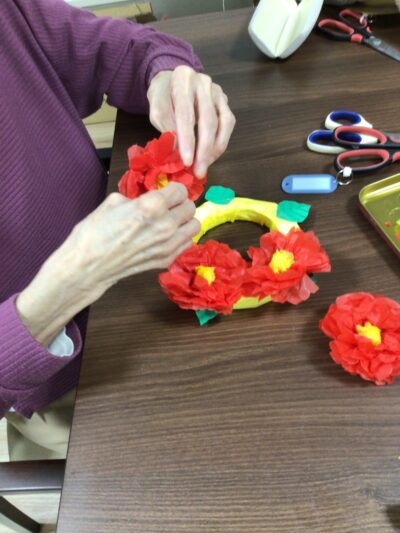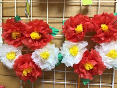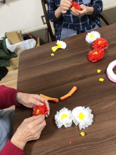 さらに、お花紙で椿の花も制作。丁寧に折り重ねることで、ふんわりとした立体感のある作品が完成しました。