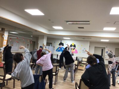 恒例の運動プログラムでは、皆さま元気に身体を動かされ、「体があたたまるね」「動くと気持ちいい」と笑顔が見られました。